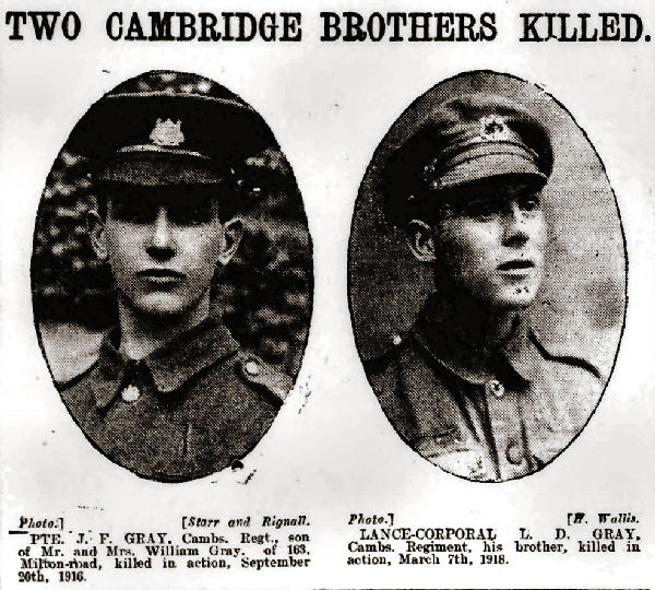 An item published in Cambridge Daily News, Monday 8 April 1918 p.3, under the heading ‘Local Casualties. Dr Alan Gray’s Youngest Son Killed in Action’:- “Sec.-Lieut. E. J. Gray – General regret will be felt at the death in action on March 31st of Sec.-Lieut. Edward J. Gray, of the Rifle Brigade, the younger son of Dr and Mrs Alan Gray, of York House, Chaucer Road. The news was received in a telegram from the War Office on Saturday, but Dr and Mrs Gray were unfortunately away from the town. The chaplain writes: “… He was searching very pluckily for a sniper who had been causing much trouble, when he himself fell a victim. Death must have been instantaneous. Our Division has won to itself great glory, but the cost has been very high. All the officers grieve over the loss of your son, whose honest, quiet fellowship was so much appreciated. The men also speak feelingly of his good sense and kind interest in their welfare.” Sec.-Lieut. Gray, who was 20 years of age, was educated at Winchester College, which he left in October 1916. He joined the Army almost immediately and went to France in June 1917.” |