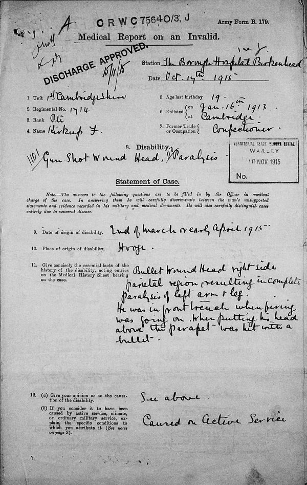 1916. Born and enlisted Cambridge. Born 18 August 1896, admitted