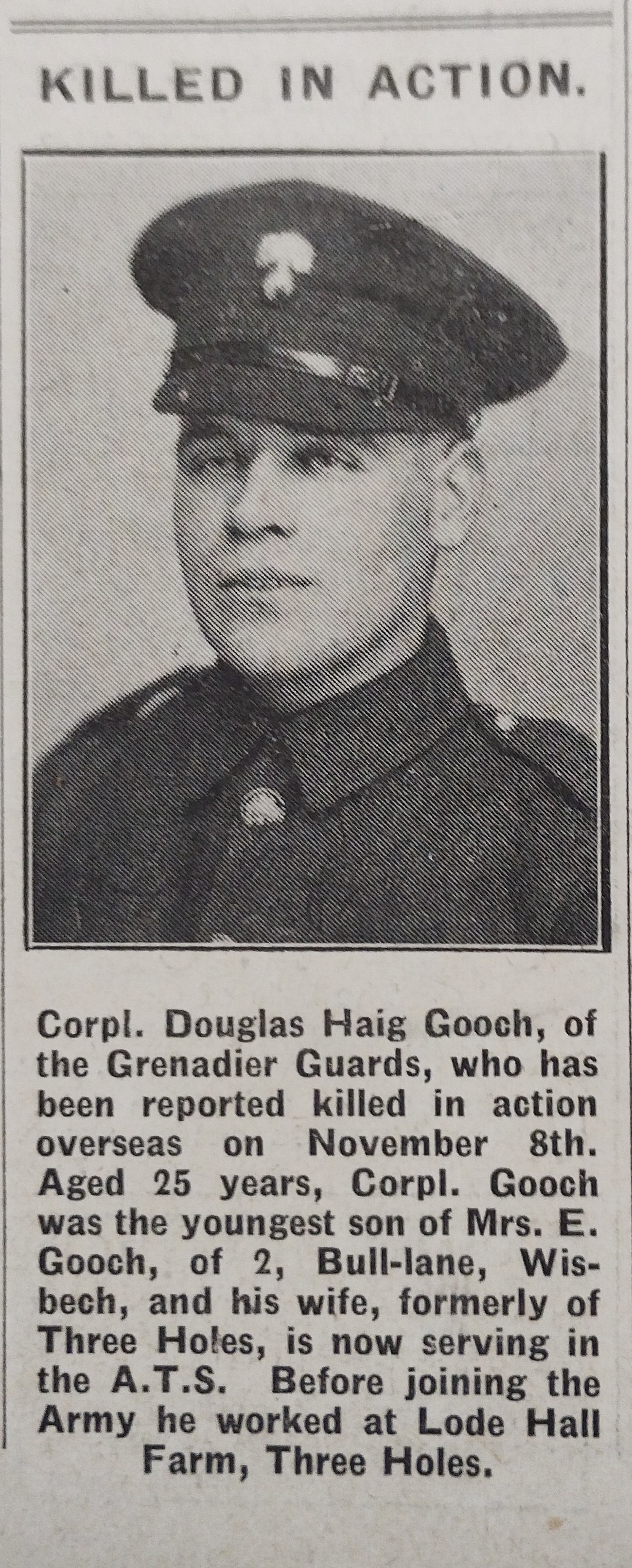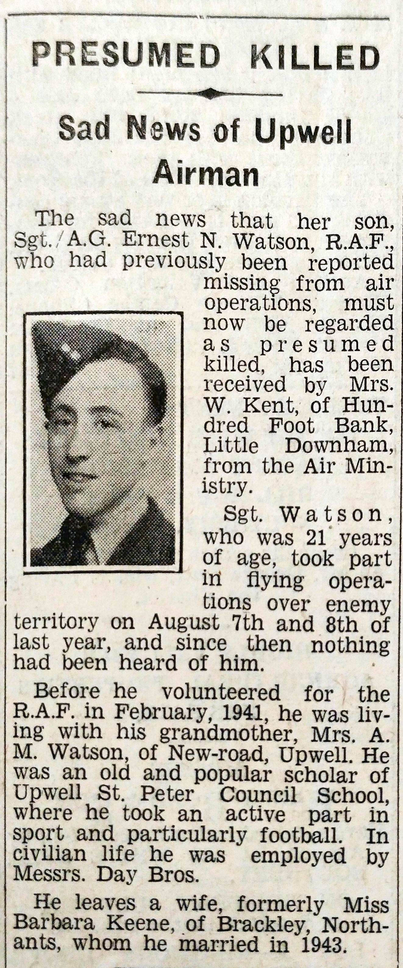 Extract from Wisbech Standard in 1943: KILLED
