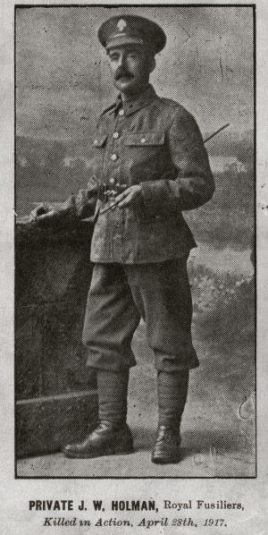 G/52560 Pte, 4th Royal Fusiliers. Killed in action 9-4-17. Formerly TR10/48925 Training Reserve Btn. Lived Horsefair, Wisbech. Tilloy British Cemetery, Tilloy-les-Mofflaines, Pas de Calais, France. See also Wisbech St Augustines
