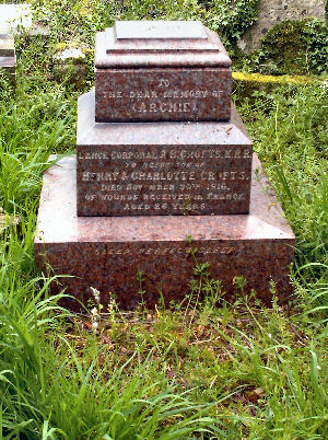 Rifleman (Lance Corporal) C/8049, 2nd Battalion, King's Royal Rifle Corps. Died of wunds in the United Kingdom 30 November 1916. Born and resident Wisbech, enlisted Kingsway, Middlesex. Son of Henry and Charlotte Crofts, of Elm Bridge, Wisbech. Buried in Elm (All Saints) Churchayrd, Cambridgeshire. See also Elm