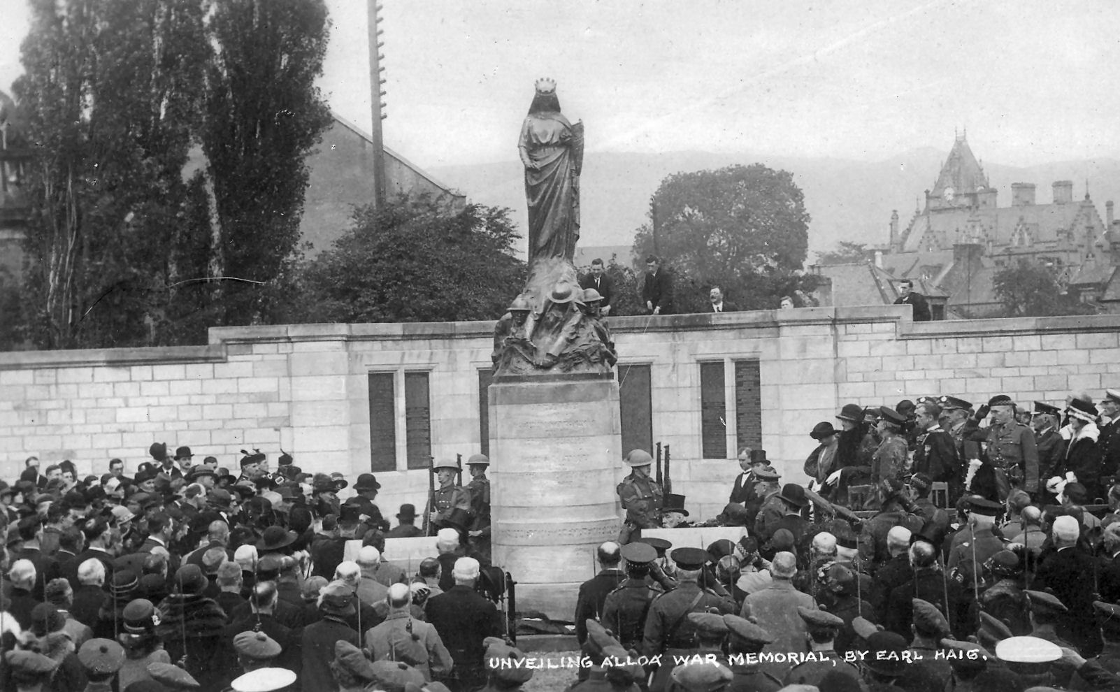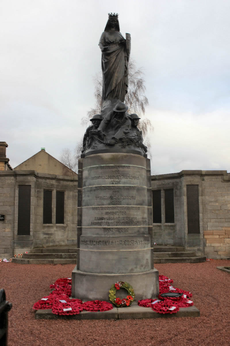 The memorial stands in Bank Street, Alloa, and takes the form of the figure of St Margaret, crowned and robed, standing above a group of three soldiers carved as if half buried in mud standing on a cylindrical pedestal. On a wall behind there is a recess containing eight inset name panels listing those who gave their lives in World War 1 and World War 2. The memorial was unveiled 28th September 1924 by Field Marshall The Earl Haig and had cost £4,400 to erect. The sculptor was Mr Charles D'Orville Pilkington Jackson and the architect Sir Robert Lorimer. One of the three soldiers has an empty hand which clearly once had something in it, this is the original description: "The bronze figure leans forward, graceful and gentle, one tender hand protectively stretched over the crouching figures below, engaged in the desperate business of war - four soldiers in fighting order, one ahead of the others, cutting a barbed-wire entanglement, one with arm strained to throw a bomb, and two riflemen with fixed bayonets, ready to attack. For the central feature, there is a figure symbolising Alloa, carrying a shield bearing the Burgh coat of arms and wearing a mural crown, the idea is: 'The Thoughts of the Town following her sons in battle.'" There are 386 names listed for World War 1 on the 4 pairs of plaques, 116 names for World War 2 and 9 civilians from World War 2 on two pairs of plaques. Although the men are listed by regiment/service thye have been merged into alphabetical order for ease of reading and research.
