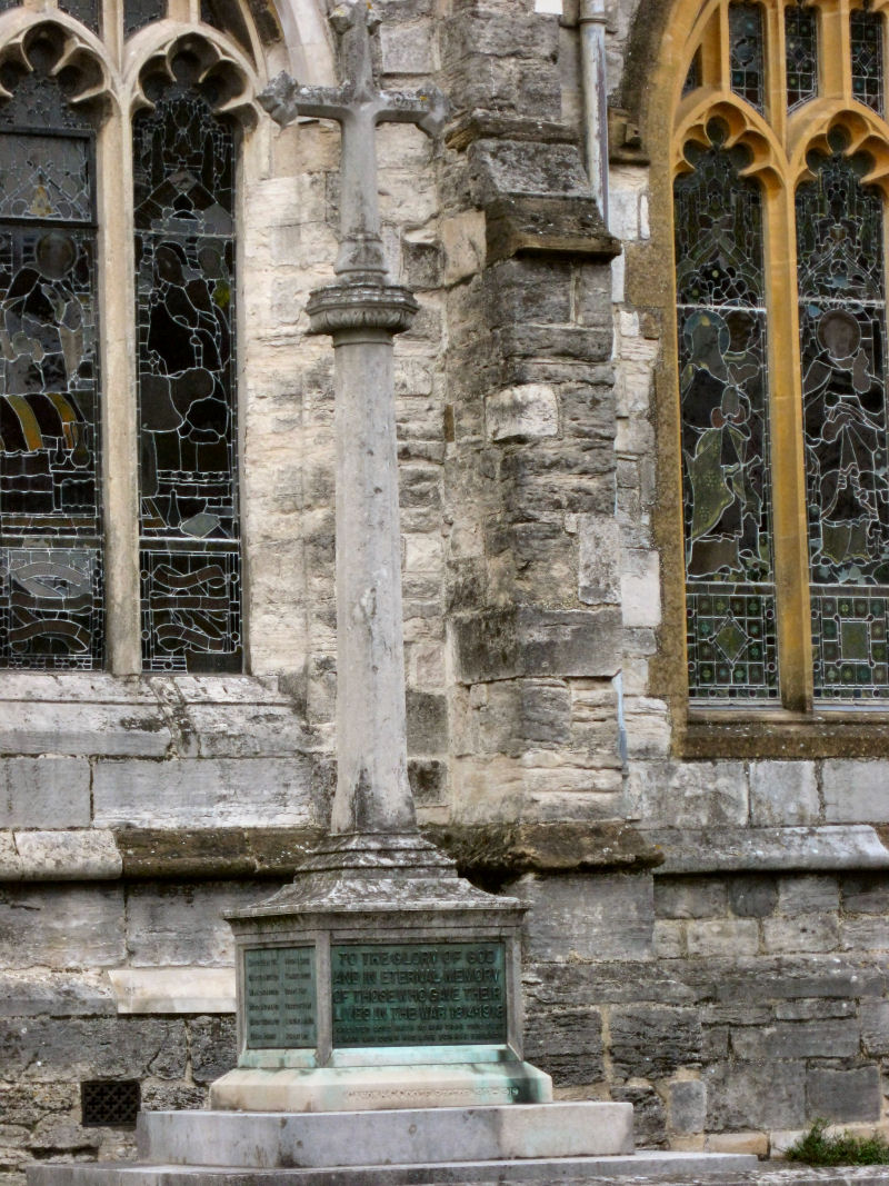 The memorial takes the form of a cross on square plinth, with a three stepped base, standing outside St Peter’s Church, High West Street, Dorchester. The memoriasl was made by Messrs. R. Membury & Sons. The names listed on this memorial are for World War 1 only. There are 24 names listed for World War 1 only. Within the church is a further memorial consisting of two brass plaques, linked and mounted onto a single backboard, borth have the arms of St. George with a carved laurel wreath and black lettering. One side commemorates World War 1 and lists 25 names, the other lists 11 names for World War 2; the World War 1 names differ vastly from the external memorial. These names are also listed here.