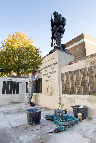 which was mounted a bronze statue of a WW1 soldier carrying a rifle