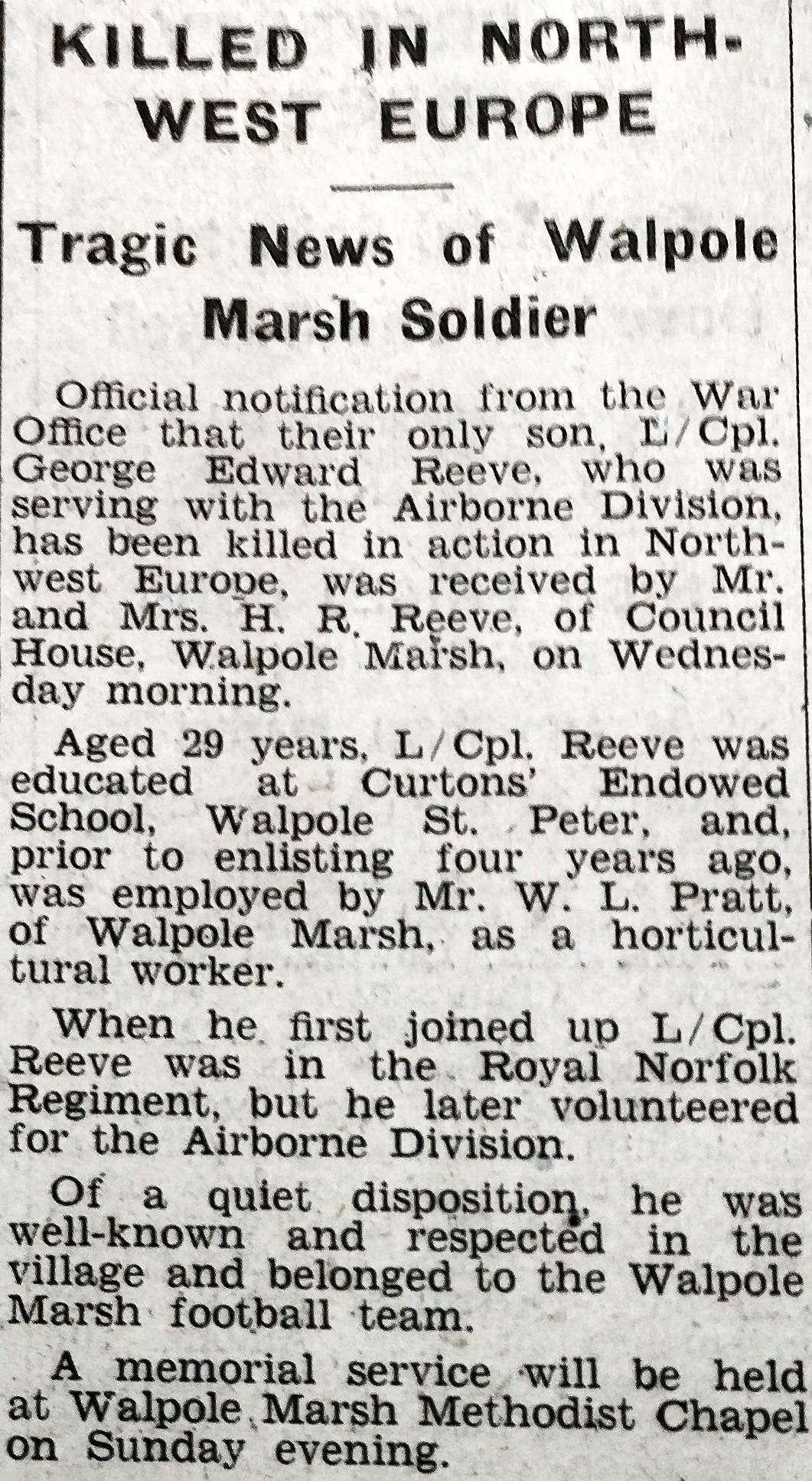 | NICHOLLS | Ernest [William] | Extract from Wisbech Standard 1945: PTE. E. W. NICHOLLS
