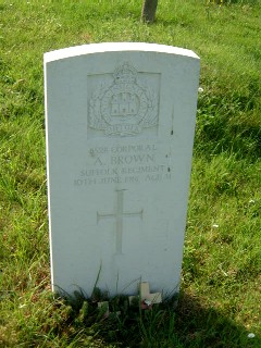 Corporal 6528, 3rd Battalion, Suffolk Regiment. Died Saturday 10th June 1916 in England. Age 31. Born Glemsford, Suffolk, enlisted Bury St Edmunds. Son of Arthur Brown, of Swan St., Kelvedon, Essex. Buried in ST. MARY CHURCHYARD, GLEMSFORD, Suffolk.