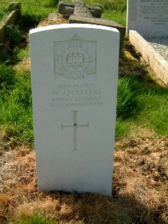 Private 15432, 2nd Battalion, Suffolk Regiment. Died of wounds Wednesday 24th March 1915 in France & Flanders. Born Glemsford, Suffolk, enlisted Sudbury. Buried in BAILLEUL COMMUNAL CEMETERY (NORD), Nord, France. Grave J. 44.
