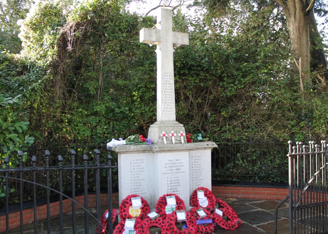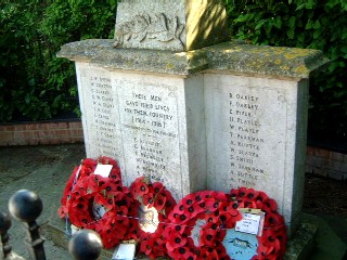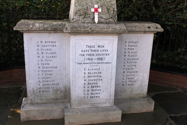 This memorial is on the main road through Glemsford village. Steve Clarke has researched the 1901 census for details of those listed here and these findings can be found on his web pages. In 1920 March 12th there was a dedication service for the War Memorial led by the archdeacon, George Hodges. This was probably a temporary structure because an offertory of £3-8-11/2 was raised towards funds. The first Armistice Day (mentioned as Armistice Day) was November 11th 1921. On November 5th 1922 at 10.45a.m., Armistice Day, there was an open-air service on Tye Green, Glemsford conducted by the Rev. Joseph Everett (from the Ebenezer Chapel) and the Rev. Banks-Williams (St. Mary's Church). At 7.30p.m. at the end of the church's evening service, there was a dedication of the War Memorial erected by the Ancient Order of Foresters, held at the Council School. This is reported in the Suffolk and Essex Free Press on November 16th 1922, so it is probable that Nov. 5th 1922 is the actual dedication date.