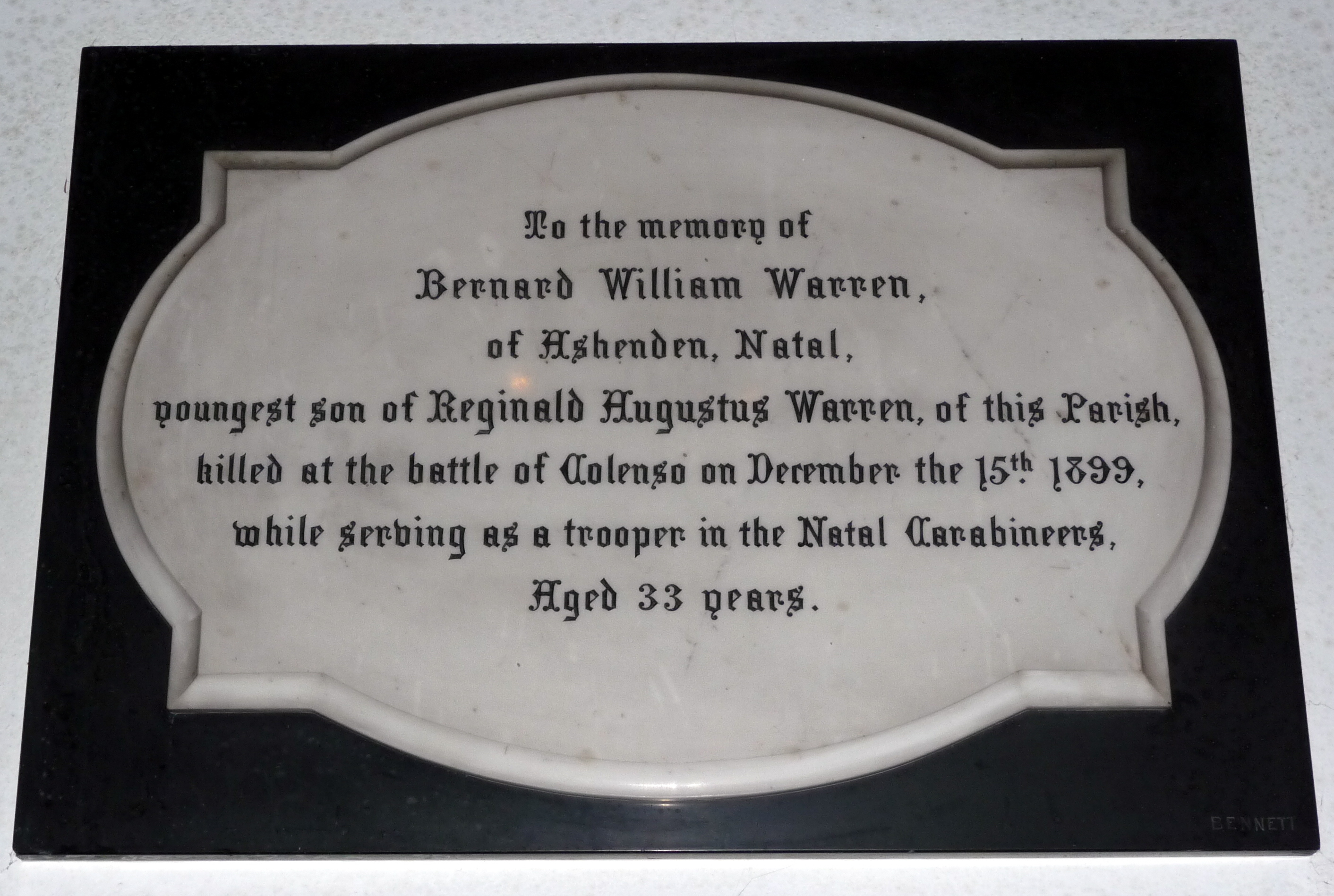 | WARREN | Bernard William | Trooper, Natal Carabineers. Killed in action in the Battle of Colenso on the 15th December 1899, aged 33. Born: East Preston, Sussex. Resident of KwaZulu-Natal, South Africa. Son of Reginald Augustas and Ann Eliza Warren, of East Preston, Sussex. No known grave. |
