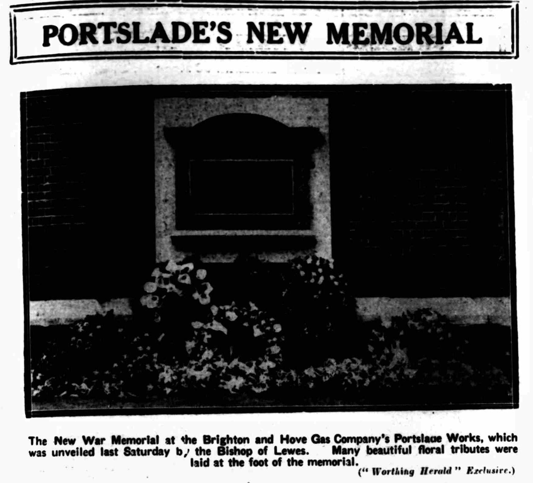 A memorial to fifty employees of the Brighton and Hove General Gas Co. who fell is the Great War war was unveiled at the Portslade Worts on Saturday, in the presence of about 500 people.