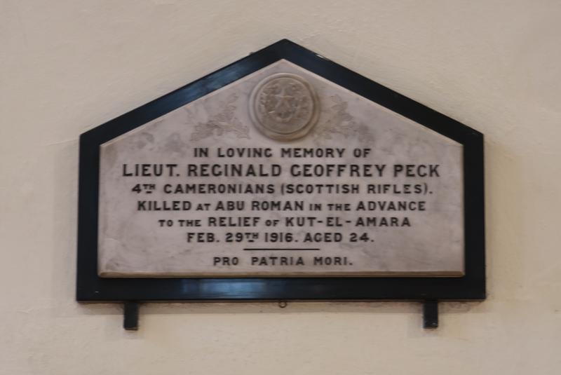 | PECK † | Reginald [Geoffrey] | Lieutenant, 4th Battalion, Cameronians (Scottish Rifles) attached to 10th Battalion, The Highland Light Infantry. 9th Scottish Division. Died of wounds 29th February 1916. Grave lost. Commemorated on Ploegsteert Memorial, Hainaut, Belgium. Panel 5. On external memroial only. There is also a plaque to him in Rustington Parish Church saying that he died in the Advance on Kut-el-Amara, Mesopotamia. This plaque was erected by his father and is in conflict with his official records giving place of death elsewhere. Which is the correct information has, as yet, to be ascertained.