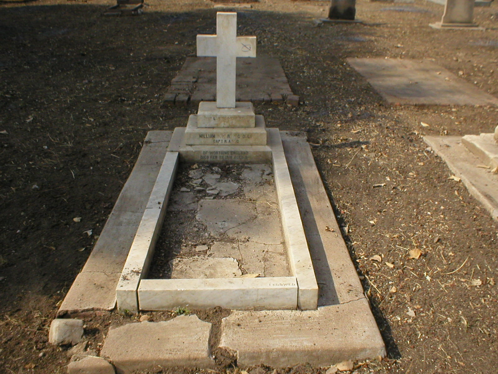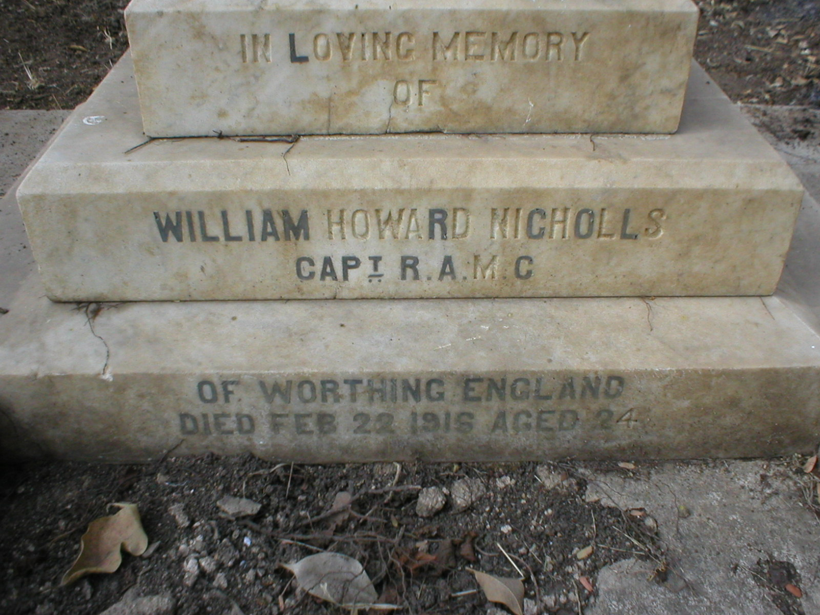 Captain, Royal Army Medical Corps. Indian Army. Died after a gun accident in Jhansi, India 22 February 1916. Aged 24. Son of Dr. & Mrs Howard-Nicholls of Bramber Lodge, 24, Downview Road, Worthing. Buried in Jhansi Cantonment Cemetery, India. Plot H. Grave 37. Commemorated on The Madras War Memorial, Chennai, India. Grave inscriptins reads: In