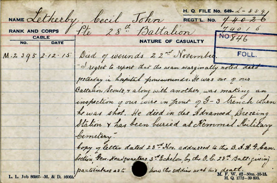 Mrs. Bond says: “I am taking it for granted you have heard of the sad news of your dear son being killed on March 4. Your son wrote me such a comforting letter, which I shall never part with, telling me of my own boy’s last few hours. He had risked his own life trying to bring my lad in, although he could not succeed, and I shall ever reverence his memory.”